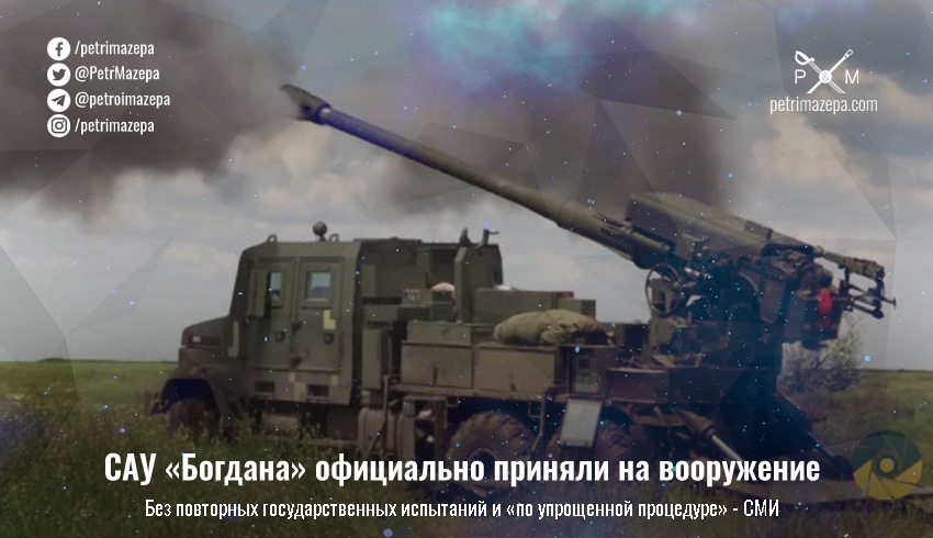 Самоходную установку украинского производства «Богдана» приняли на вооружение Вооруженных сил Украины. По данным СМИ, она не проходила повторных государственных испытаний и принята на вооружение по упрощенной процедуре.