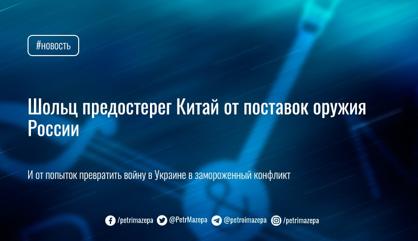 Канцлер Германии Олаф Шольц после переговоров с премьер-министром Китая Ли Цяном заявил, что призвал Китай больше использовать свое влияние на Россию относительно войны против Украины, не поставлять России оружие и не способствовать превращению войны в замороженный конфликт.