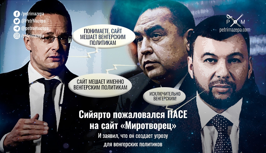 Сийярто назвал существование сайта «Миротворець» отдельной проблемой. «Миротворець» - список врагов, которые должны быть наказаны. Я и сам в этом списке, но для меня это не проблема, меня защищает контртеррористическая служба Венгрии. Но те, кто живут в Украине, имеют больше оснований бояться», - заявил он членам ПАСЕ.
