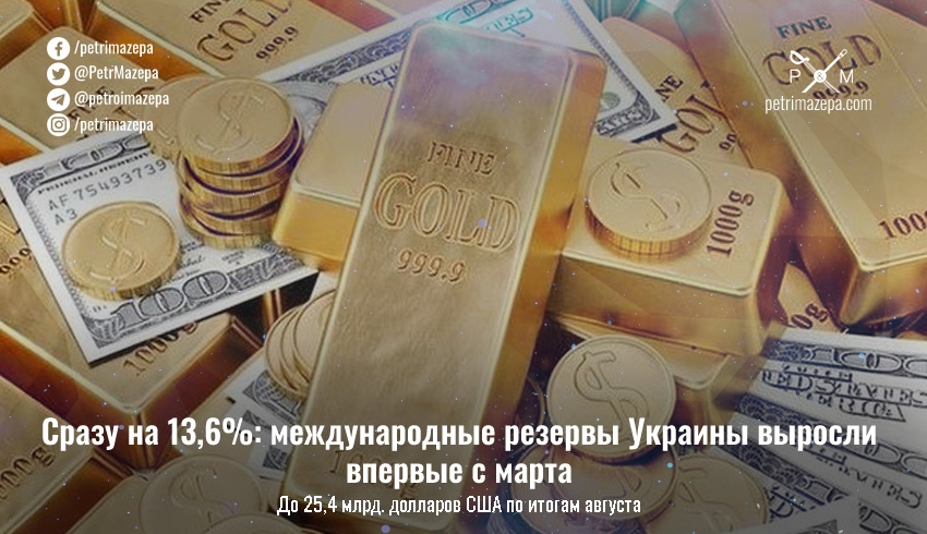 По состоянию на 1 сентября 2022 года международные резервы Украины по предварительным данным составили 25 млрд 436,0 млн долларов. В августе они увеличились на 13,6%, благодаря поступлению значительного объема международной помощи на фоне умеренных долговых выплат.