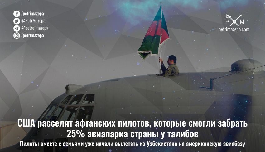 585 граждан Афганистана – пилоты и члены их семей -  перед взятием Кабула талибами вылетели из столицы Афганистана на 46 самолетах и вертолетах. Обученные в США пилоты, фактически угнали транспорт, чтобы спасти его, себя и членов своих семей от Талибана. Они почти месяц находились в Узбекистане и теперь начали вылетать на американскую авиабазу в Катар.
