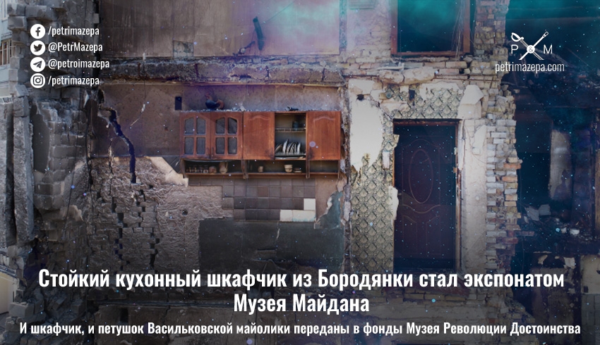 Знаменитый кухонный шкафчик из Бородянки, ставший символом стойкости, передан в Музей Революции достоинства. Его демонтировали со стены дома, который угрожает обвалиться в любой момент, и поместили в музейный фонд.