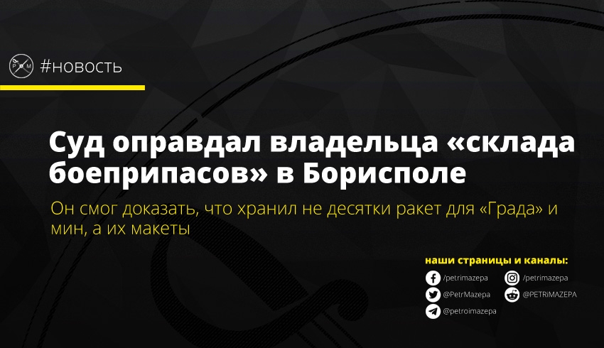 Бориспольский горрайонный суд Киевской области оправдал Геннадия Конева, которого обвиняли в хранении огнестрельного оружия. В ноябре 2016 года полиция радостно отрапортовала об обнаружении цеха и склады с оружием. Среди находок полиции называли 6- 60 снарядов-ракет для установки «Град» и 150 минометных мин. Спустя три года Конев смог доказать, что это – законно купленные макеты.