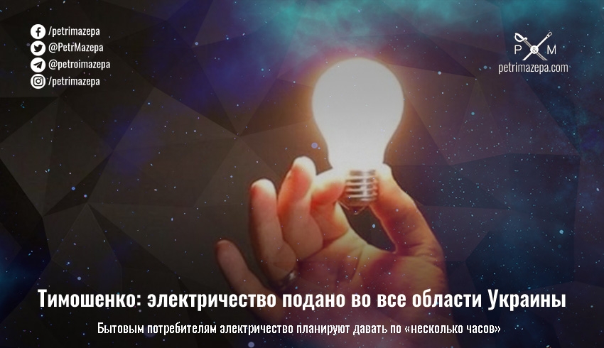 Замглавы ОПУ Кирилл Тимошенко рассказал, что электроэнергию подали во все области Украины. Первыми заживили объекты критической инфраструктуры.