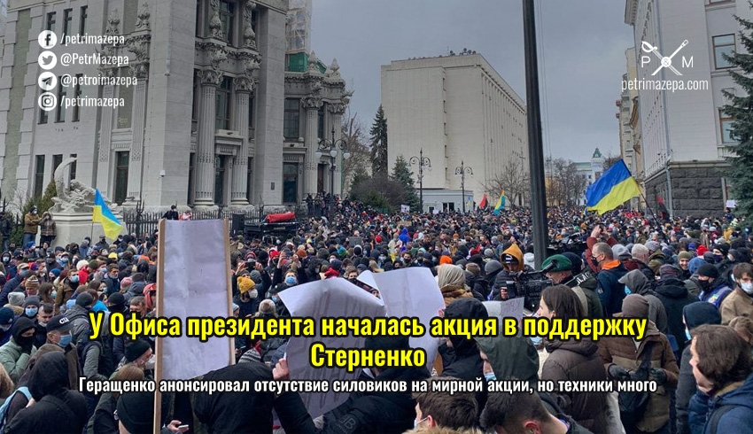 В 12 часов дня, как и было анонсировано, у Офиса президента Украины началась вторая за неделю акция в поддержку активиста и блогера Сергея Стерненко. Перед началом акции появились фото с большим количеством автозаков из центра Киева. Хотя вчера замминистра внутренних дел Антон Геращенко говорил, что кордонов не будет, если акция будет мирной.