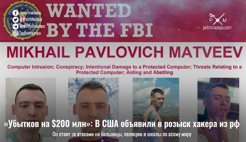 В США объявили в розыск российского хакера Михаила Матвеева — он был причастен к атакам на критическую инфраструктуру США, и распространял вирусы-вымогатели. В целом его программы требовали 400 миллионов долларов от жертв и получили около 200 миллионов долларов.