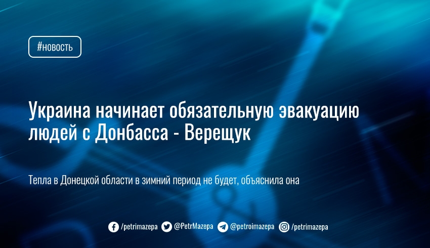 «В Донецкой области абсолютно отсутствует газоснабжение, все газопроводы, которые можно было отремонтировать, они отремонтировали, но, к сожалению, враг снова и снова уничтожает все, что помогло бы зимой обогреть людей. Одним словом, тепла в Донецкой области в зимний период не будет. 33-я статья Кодекса о гражданской защите населения говорит о такой форме эвакуации как обязательная. Я считаю, что это обязанность каждого члена семьи. В Донецкой области 52 тысячи детей, их нужно эвакуировать, нельзя подвергать их смертельной опасности — в зимний период без тепла, без света, без возможности обогреть», — сказала Верещук.