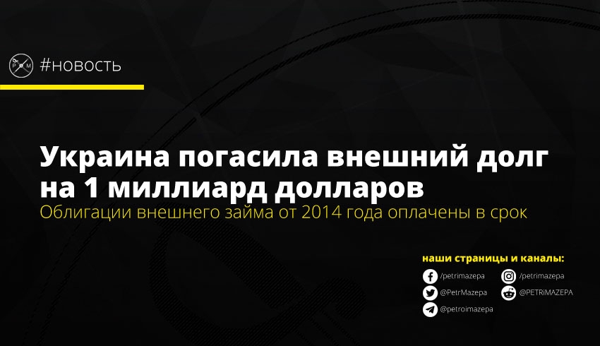 Министерство финансов Украины погасило внешний долг на сумму в 1 млрд долларов. Были погашены Облигации внешнего государственного займа, выпущенные еще в 2014 году.