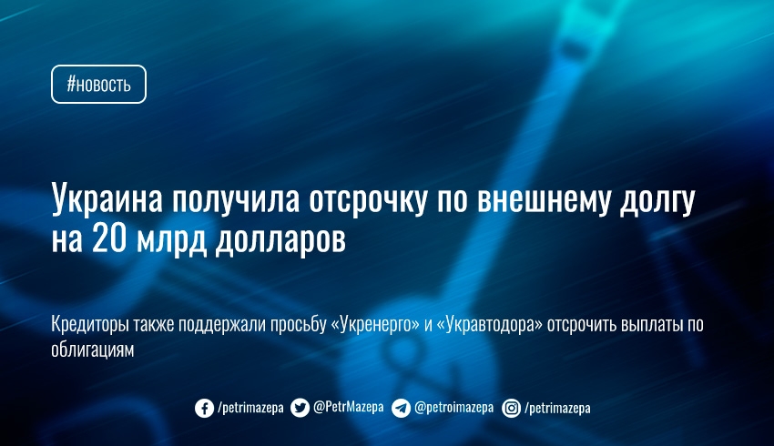 Зарубежные кредиторы согласились дать Украине отсрочку по внешнему долгу на 20 миллиардов долларов и поддержали просьбу «Укрэнерго» и «Укравтодора» отсрочить выплаты по облигациям.
