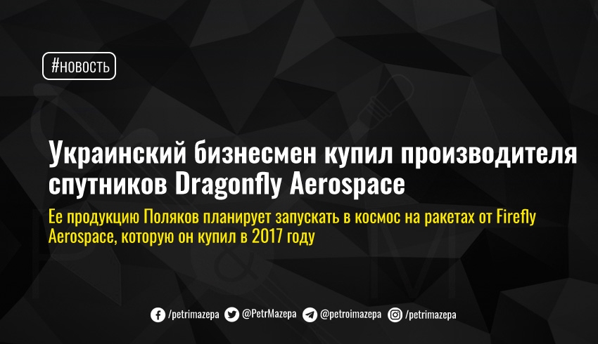 Украинский бизнесмен и владелец аэрокосмической компании Firefly Aerospace Макс Поляков купил южноафриканского производителя малых космических спутников Dragonfly Aerospace. Сумма сделки не сообщается.