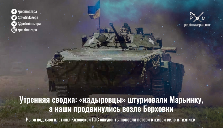 В Минобороны Великобритании отмечают, что тяжелые бои продолжаются на многих направлениях, и на большинстве из них Украина удерживает инициативу. На Марьинку уже бросали «кадыровские» подразделения, но те не справились. Сегодня также ожидается начало снижения напора воды, которая идет с взорванной Каховской ГЭС.
