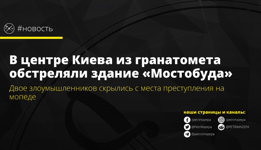 В центре Киева неизвестные злоумышленники открыли стрельбу по фасаду здания «Мостобуда», расположенного по адресу улица Паньковская, 5. По предварительной информации, выстрел произвели из гранатомета. Никто не пострадал.