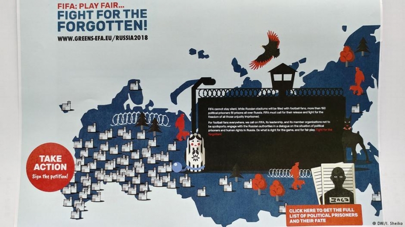 Фракция «зеленых» в Европарламенте представила интерактивную карту России, на которой отмечены все места лишения свободы, где удерживаются политические заключенные. Цель этой акции - в преддверии чемпионата мира по футболу обратить внимание болельщиков на нарушение прав человека в России.