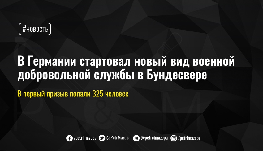 Министр обороны ФРГ Аннегрет Крамп-Карренбауэр рассказала, что первые 325 призовников начинают свою службу в учебных подразделениях базы вооруженных сил и ВВС, передает DW. Новая инициатива предусматривает 7-месячную службу, из которых 3 месяца будут посвящены интенсивной подготовке. Сначала ежегодно планируется набирать 1000 заинтересованных людей.