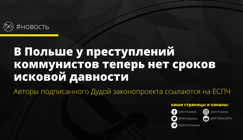 Президент Польши Анджей Дуда подписал закон, который отменил применение сроков исковой давности к преступлениям, совершенным функционерами тоталитарного государства. Предыдущая редакция данного закона делала невозможной расследование дел по ряду статей после 1 августа 2020 года.