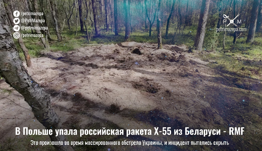 Ракета, которая упала на севере Польши — это российская Х-55, сообщает издание RMF FM со ссылкой на выводы экспертов. Вероятно, она была запущена с российского самолета над территорией Беларуси, когда агрессор совершил очередной массированный ракетный обстрел Украины.