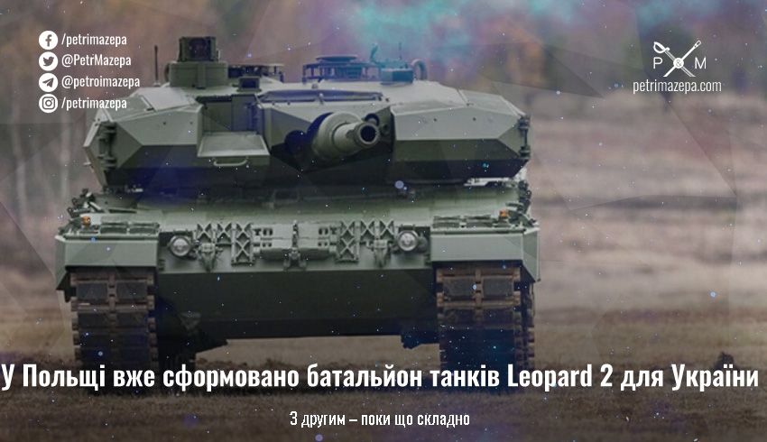 25 января правительство Германии поставило задачу скоро собрать для Украины два танковых батальона с танками Leopard 2 (обычно в Украине они оборудованы 31 танком каждый). Сегодня стало известно, что в Польше сформирован батальон танков Leopard 2 для Украины. Однако со вторым батальоном проблемы.