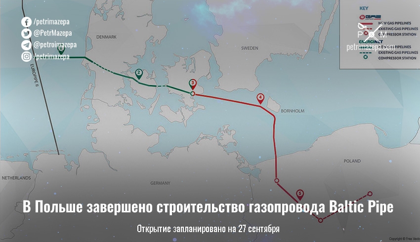 В Польше завершилось строительство газопровода Baltic Pipe. Он позволит уменьшить газовую зависимость от россии, поскольку обеспечивает пути поставки 10 млрд кубометров газа с норвежского шельфа.
