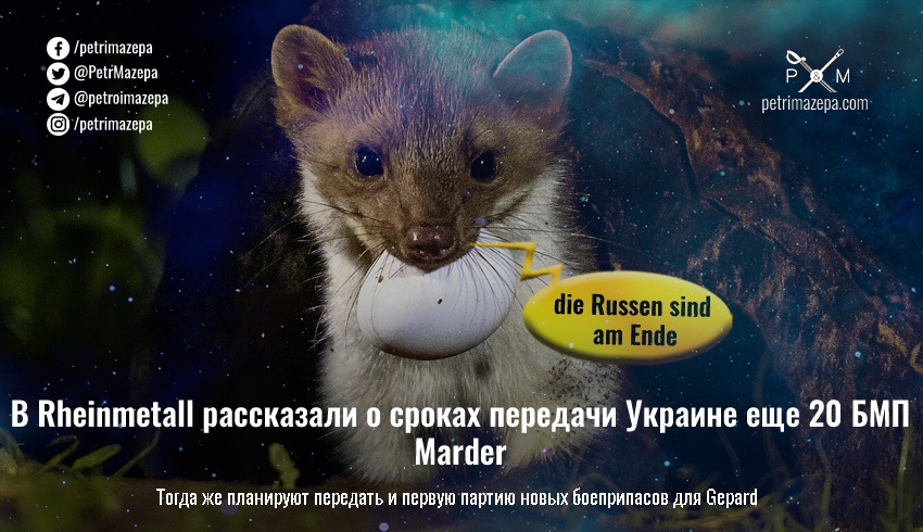 Во вторник компания объявила на своей производственной площадке в Унтерлюсе (Нижняя Саксония), что получила заказ от Федерального министерства обороны на 20 боевых машин пехоты Marder. Транспортные средства должны быть доставлены в Украину до конца июля, пишет издание RND.