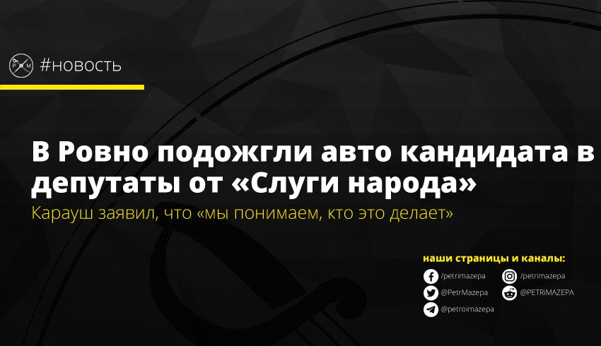 В Ровно подожгли автомобиль кандидата в депутаты от «Слуги народа», директора облводоканала Андрея Карауша. По словам самого кандидата, поджог связан с его политической деятельностью, он понимает, кто это делает, однако «нельзя называть сегодня партии».