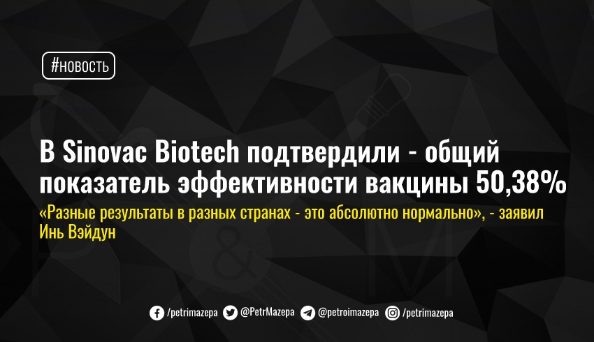 - 20 января Sinovac Biotech заявила, что ее вакцина против коронавируса показала высокий процент эффективности при условии увеличении времени между двумя вакцинациями с 14 до 21 дня. Однако к такому выводу в компании пришли, изучив результаты 1 394 пациентов.