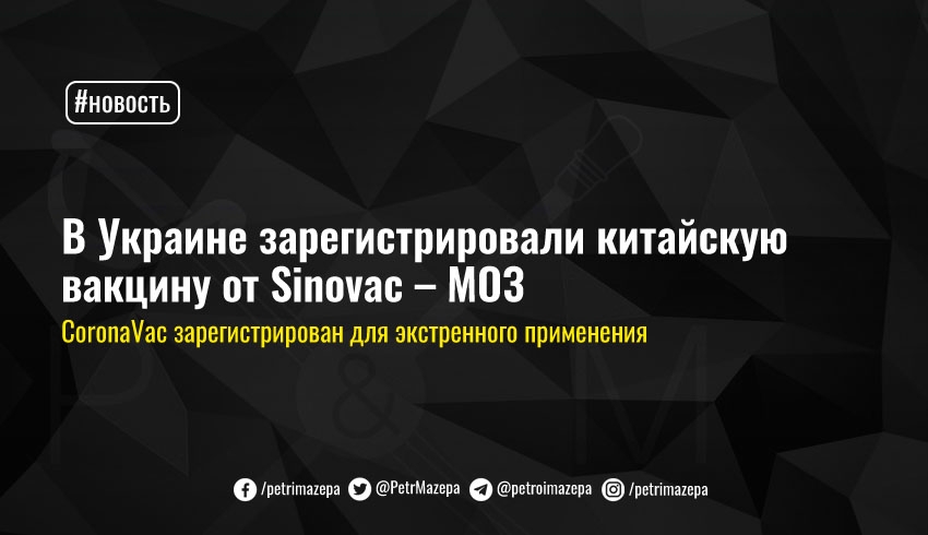 Министерство здравоохранения Украины зарегистрировало в Украине вакцину от COVID-19 под названием CoronaVac, которая производится китайской компанией Sinovac. Препарат зарегистрирован для экстренного применения на основании изучения предоставленных производителем материалов.