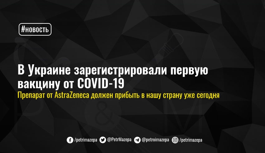 В Украине прошла регистрацию первая вакцина от COVID-19 – это разработка компании AstraZeneca, которая производится на мощностях в Индии. Одобренный для экстренного использования препарат должен прибыть в Украину уже сегодня.