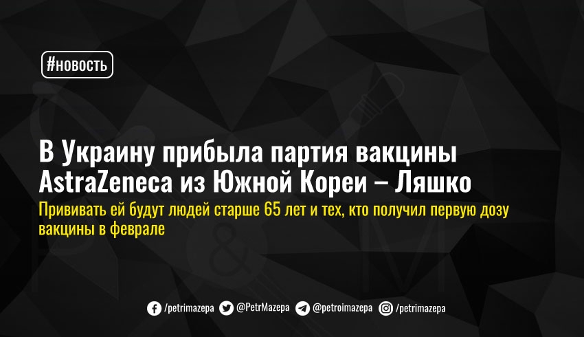 «"Сегодня в Украину прилетела очередная партия вакцин от глобальной инициативы COVAX, которая обеспечивает равный доступ к вакцинам для жителей всего мира. Мы говорим о партии 367 200 доз AstraZeneca, которая произведена в Южной Корее. Напомню, что эта вакцина разработана Оксфордским университетом в сотрудничестве с британско-шведской компанией AstraZeneca.... Эта партия вакцин будет использоваться в большинстве своем в кабинетах вакцинации для людей в возрасте 65+ и старше. Часть партии будет оставлена для проведения второй прививки людям, сделавшим прививку в период с 24 февраля», - цитирует Виктора Ляшко издание «Укринформ».