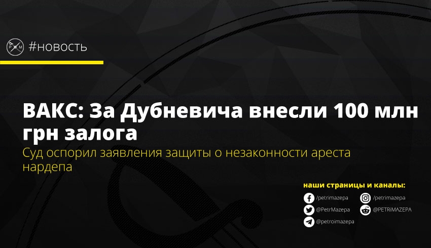 - 2 ноября ВАКС избрал в качестве меры пресечения Дубневичу залог в 100 млн грн. Под арест его не взяли – оснований оказалось недостаточно, а на поруки не отправили, потому что суд посчитал это не уместным. Тогда нардеп заявлял, что денег на залог у него нет.