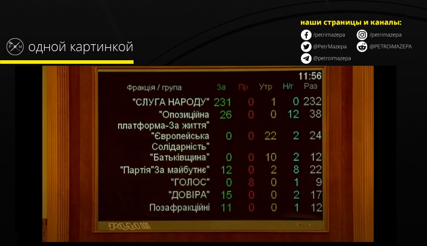 В первом чтении за законопроект от Зеленского проголосовало 326 депутатов, а за принятие закона в целом – 295 депутатов.