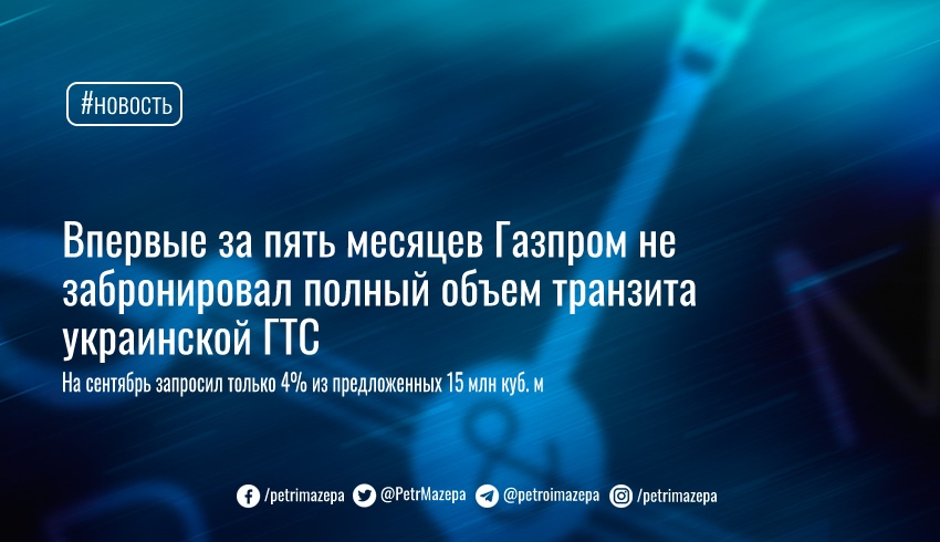 Российский Газпром забронировал на сентябрь только 4% (0,65 млн куб.м в сутки) из предложенных 15 млн куб м в сутки дополнительных твердых мощностей транзита через украинскую газотранспортную систему.