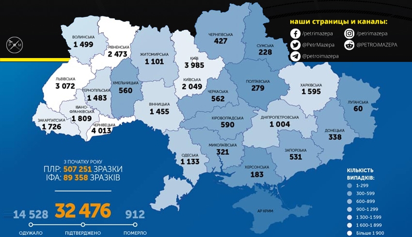Всего в стране подтверждено 32476 случаев COVID-19, из них 14 528 выздоровели (+275 за прошлые сутки), 912 умерли (+11). За последние сутки лабораторно подтверждено 666 случаев. В Украине в целом проведено исследований методом ПЦР – 507251 (+9376), а методом ИФА – 89358 (+7097).