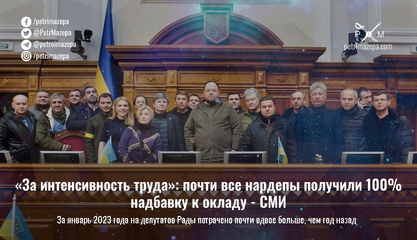 Почти все депутаты Верховной Рады Украины, 396 (из 415), получили в январе 100% надбавку к окладу «за интенсивность труда». Средняя выплата на 1 депутата составила 48,8 тыс., больше всего получил глава ВР Руслан Стефанчук, а меньше всего депутаты Лунченко и Дубинский.