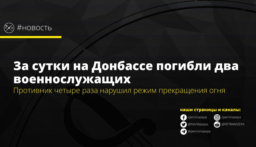 За сутки террористы и российские оккупанты четыре раза нарушили режим прекращения огня, в том числе обстреляв наши позиции из запрещенных Минскими соглашениями 82-х мм минометов. Погибли два военнослужащих, еще один получил ранения.