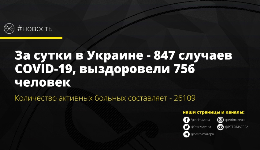 За сутки в Украине - 847 случаев COVID-19, выздоровели 756 человек