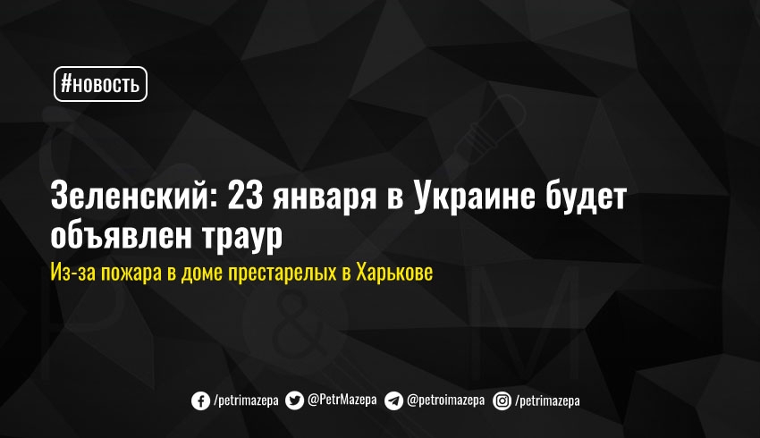 Траур объявляют в связи с гибелью 15 человек в незаконном доме престарелых при вчерашнем пожаре. «Я еще раз высказываю свое сочувствие всем родным и близким погибших, всем харьковчанам. Я подпишу указ, и завтра будет день траура на государственном уровне», - цитируют Зеленского на официальном сайте президента.