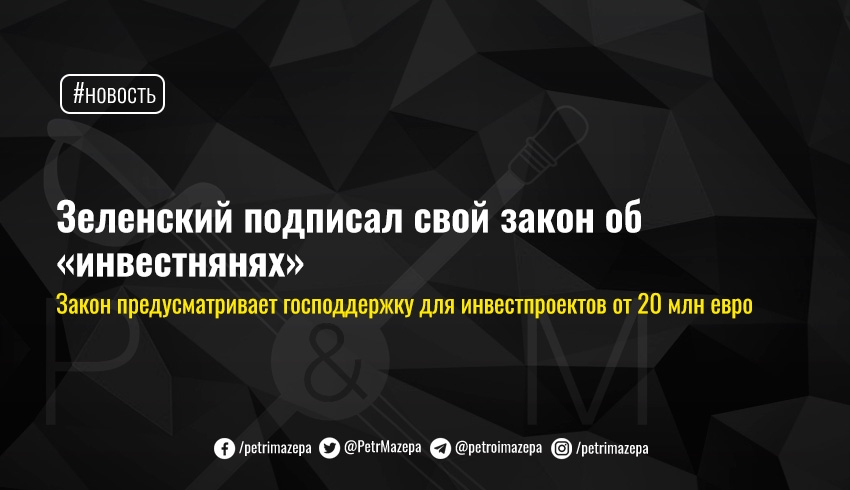 Президент Владимир Зеленский подписал закон «О государственной поддержке инвестиционных проектов со значительными инвестициями в Украине» № 1116-их, который Верховная Рада приняла 17 декабря прошлого года. Он больше известен как закон Зеленского об «инвестнянях».
