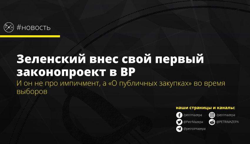 Президент Украины Владимир Зеленский подал на рассмотрение Верховной Рады первый законопроект. Речь идет о внесении изменений в закон Украины «О публичных закупках», касающихся осуществления закупок во время избирательного процесса.