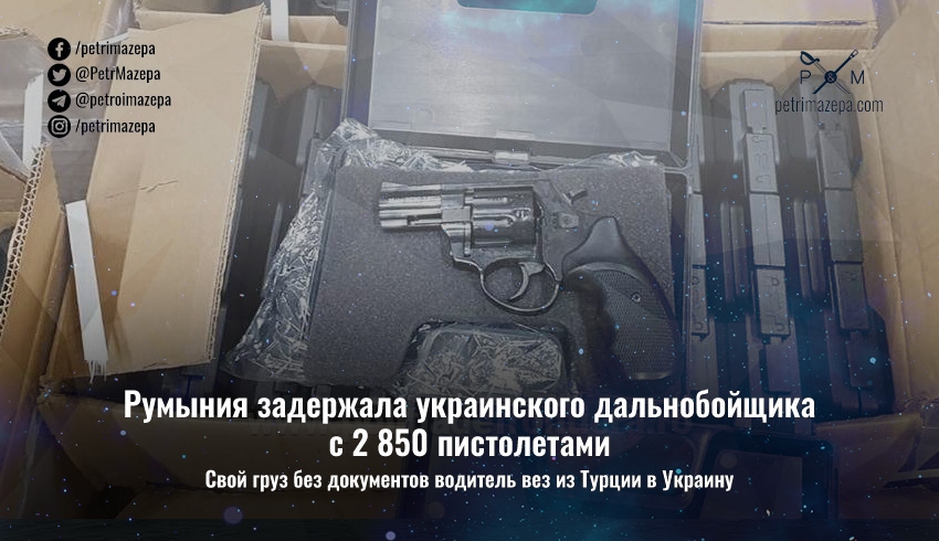В Румынии на пункте пропуска Исакча (Тулча) в грузовике, за рулем которого находился гражданин Украины, обнаружили 2 850 пистолетов, на перевозку которых не было необходимых разрешений. По документам в транспортном средстве были продукты и мебель, которые следовало из Турции доставить в Украину.