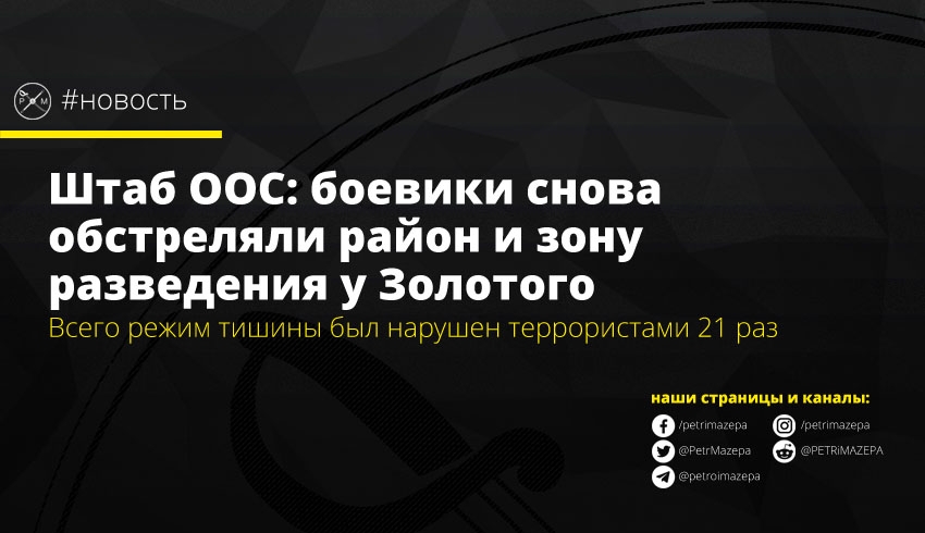 В штабе ООС сообщили, что за вчерашний день боевики 21 раз нарушили режим тишины, в том числе и у Золотого, как за пределами, так и в границах зоны разведения. Враг обстреливал позиции ВСУ в том числе из запрещенных Минскими соглашения минометов 120 и 82 калибра. Сегодня боевики обстреляли украинские позиции уже 3 раза.
