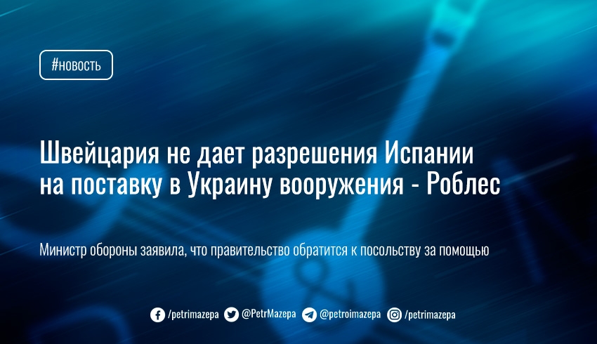 Министр обороны Испании Маргарита Роблес заявила, что Швейцария как производитель не дает разрешения на реэкспорт в Украину определенных типов вооружения