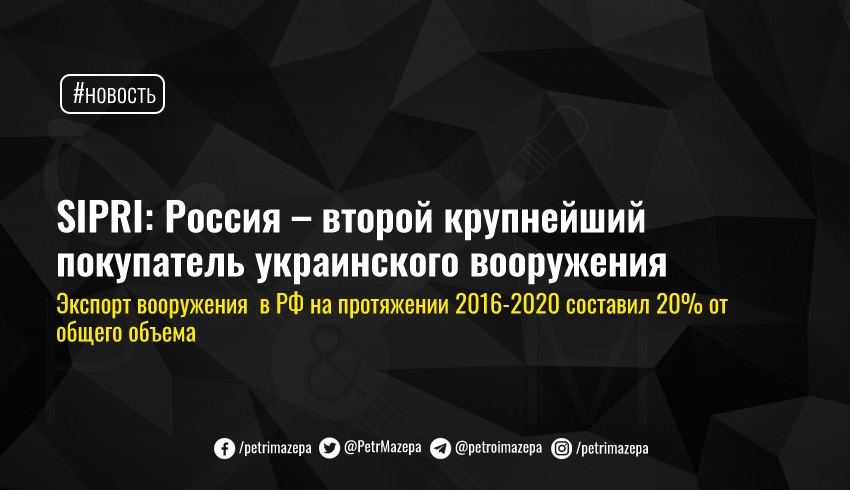 Согласно данным Стокгольмского института исследований проблем мира (SIPRI). Россия вошла в тройку крупнейших покупателей украинского вооружения за период 2016-2020 годов.