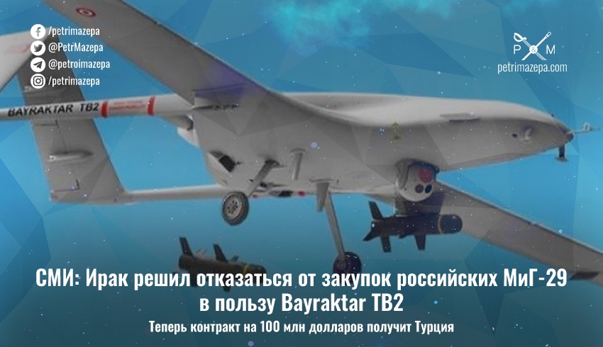 Правительство Ирака отказалось от идеи закупить истребители «МиГ-29» у РФ. Все 100 млн долларов, которые планировали потратить на закупку 12 таких самолетов теперь думаю потратить на 20 турецких беспилотников Bayraktar TB2.