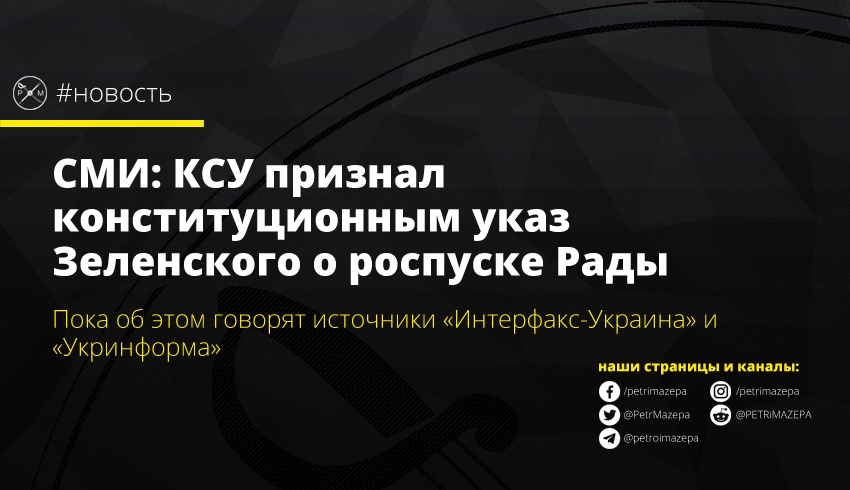 Конституционный суд Украины (КСУ) признал конституционным указ президента Украины Владимира Зеленского о роспуске Верховной Рады и назначении внеочередных парламентских выборов. Решение принято сегодня на закрытом заседании Палаты, сообщили агентствам «Интерфакс-Украина» и «Укринформ» информированные источники.