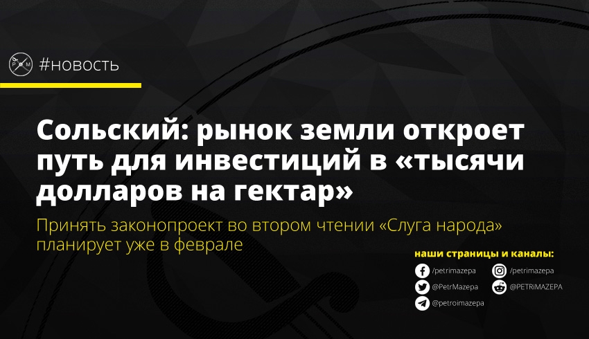 Председатель Комитета Верховной Рады Украины по вопросам аграрной и земельной политики Николай Сольский (фракция «Слуга народа») сообщил, что с законом про рынок земли сельскохозяйственного назначения «некуда уже тянуть» и в феврале он должен быть взят в работу. А также – поделился наработками о том, как не споткнуться на четырех тысячах поправок, и сообщил, что все «острые углы сглажены».