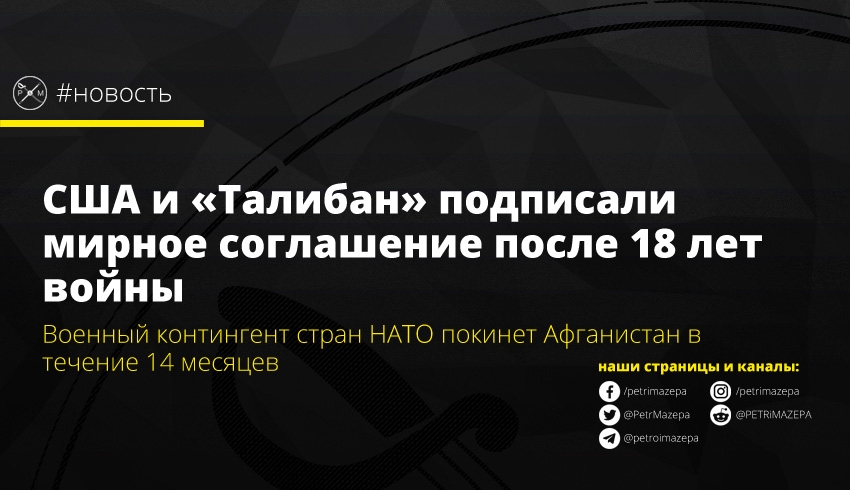 США и афганская исламистская группировка «Талибан» подписали мирное соглашение, которое должно положить конец 18-летней войне в Афганистане. Если ситуация не будет ухудшаться, то уже через 14 месяцев в стране не должно остаться военного контингента США и других стран НАТО. Первый же этап закончится через 135 дней.