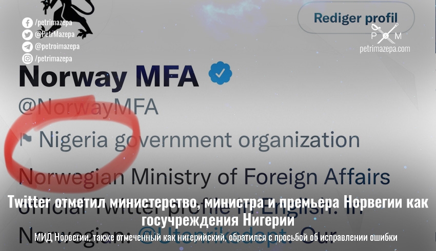 Там также уточнили, что как нигерийские теперь обозначены и аккаунты премьер-министра и министра иностранных дел Норвегии. За время написания этой новости ситуация уже была исправлена, теперь эти аккаунты обозначаются как государственные учреждения Норвегии.
