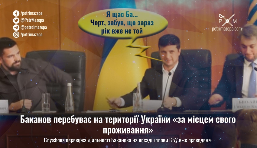 Колишній голова Служби безпеки України (СБУ) Іван Баканов перебуває на території України. А службова перевірка діяльності Баканова вже проведена, але її результати містять державну таємницю, тому жодних деталей поки не оприлюднюють.