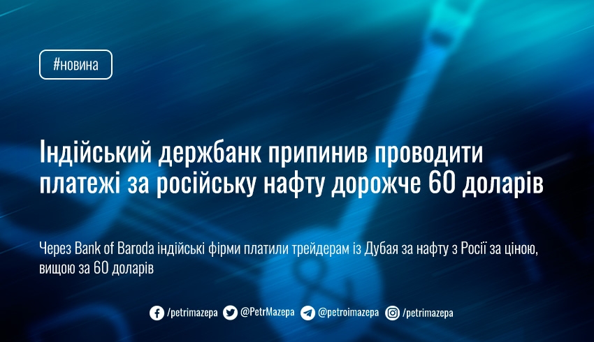 Індійський державний Bank of Baroda з цього місяця припинив розрахунки за російську нафту, продану вище за цінову межу в 60 доларів за барель.