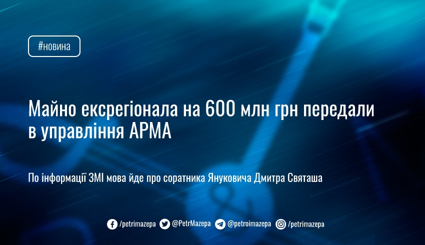 Прокуратура передала в АРМА майно та активи колишнього народного депутата (IV-VIII скликання) на суму понад 600 млн грн. Наразі він перебуває у розшуку та переховується у РФ. За даними ЗМІ, йдеться про соратника Віктора Януковича «регіонала» Дмитра Святаша.